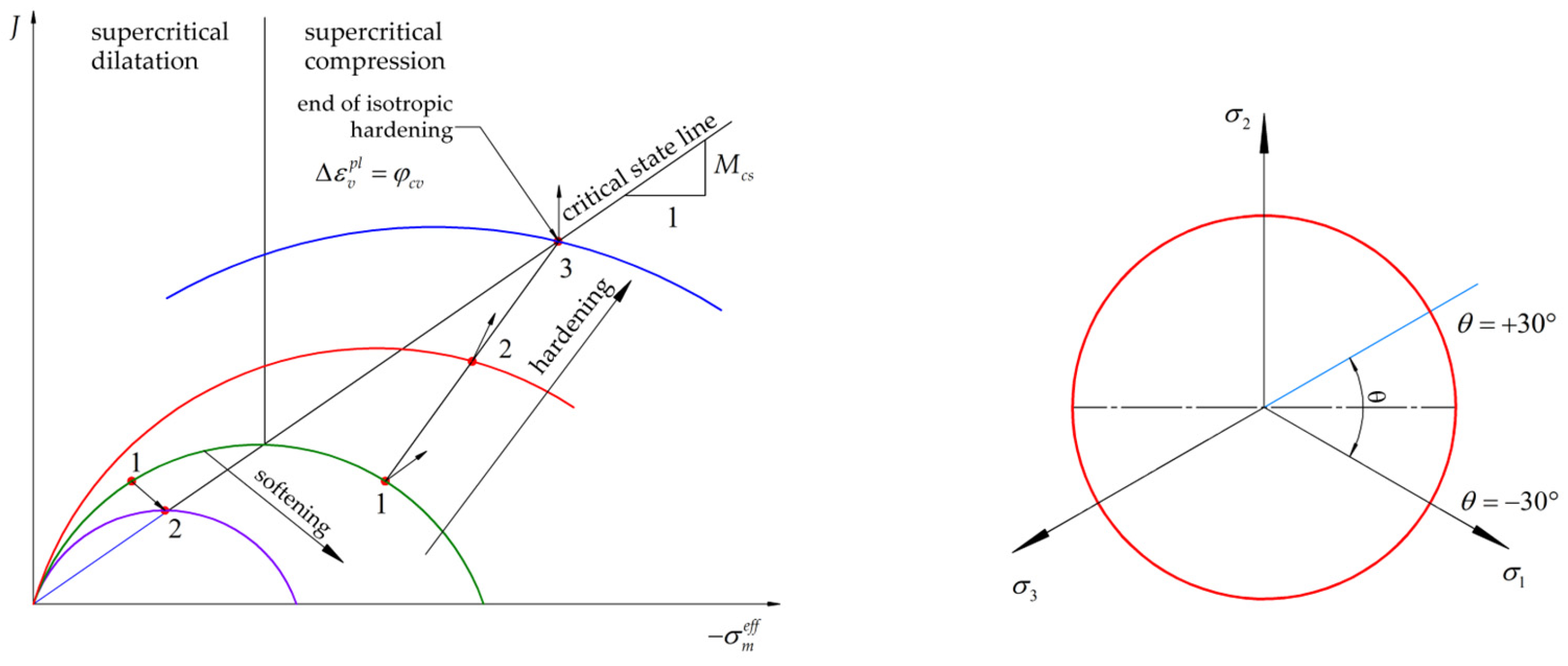 The yield surface is smooth, and tensile states are not allowed. Unlike early formulations, the MCC model explicitly represents strain hardening and softening in both normally consolidated and over consolidated soils, with a nonlinear link between volumetric strain and effective mean stress under ideal-plastic bounds. In shear, the material can deform plastically without immediate failure (Figure 3): points 1 and 2 illustrate hardening and softening paths up to the critical state (points 3 and 2, respectively). Beyond that state, shear straining proceeds with constant void ratio e and constant effective mean stress σ m e f f under ideal plasticity. Upon unloading, linear response is taken as a linear elastic.