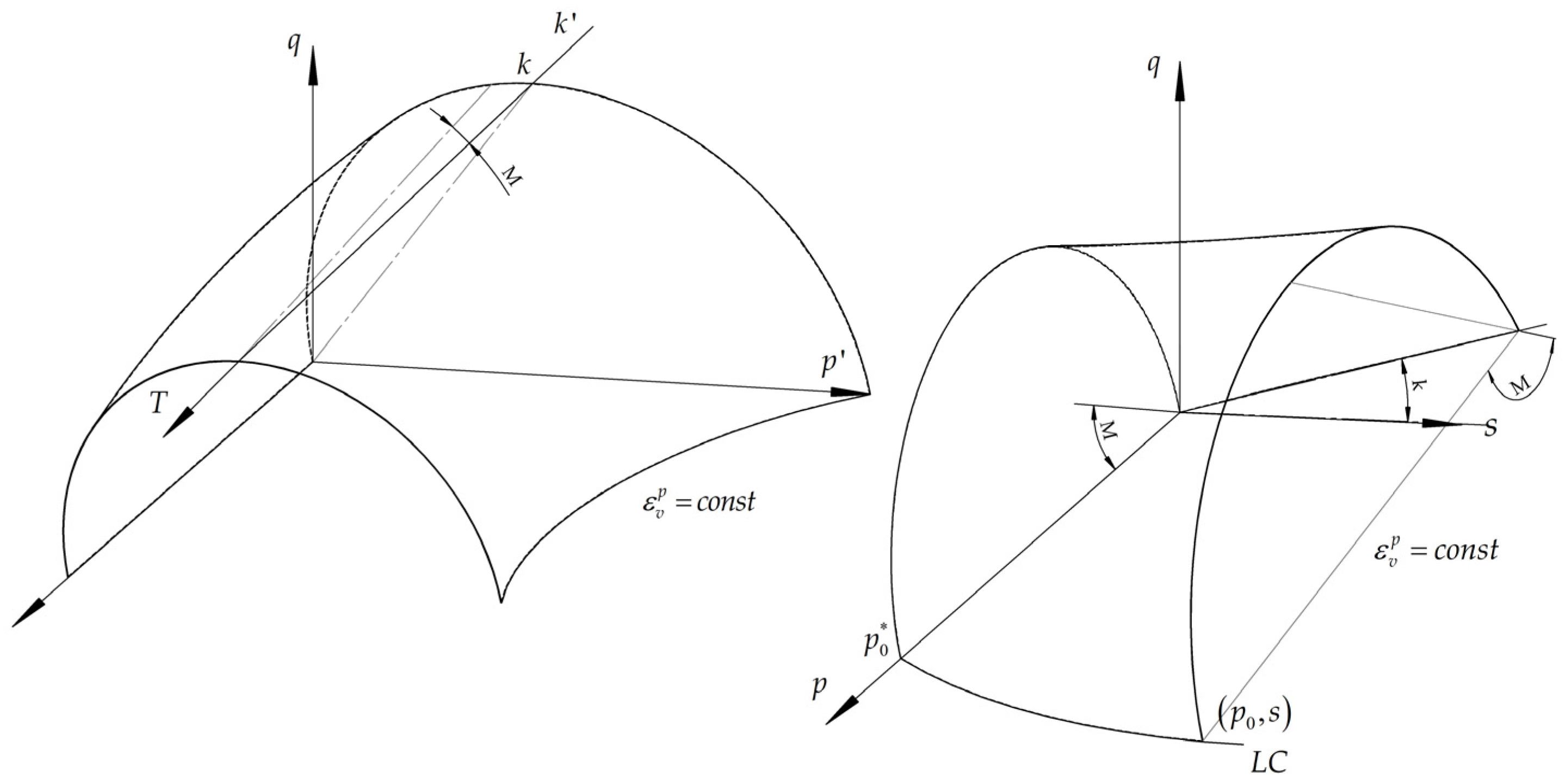 Figure 4 presents the three-dimensional representation of the yield surface in the thermo-elasto-plastic BBM within both the pqspqs and p′−qTp′−qT stress spaces, where pp′ denotes net mean stress (total stress minus gas-phase pressure), q represents deviatoric (shear) stress, s is matric suction, and T corresponds to temperature [76,87].