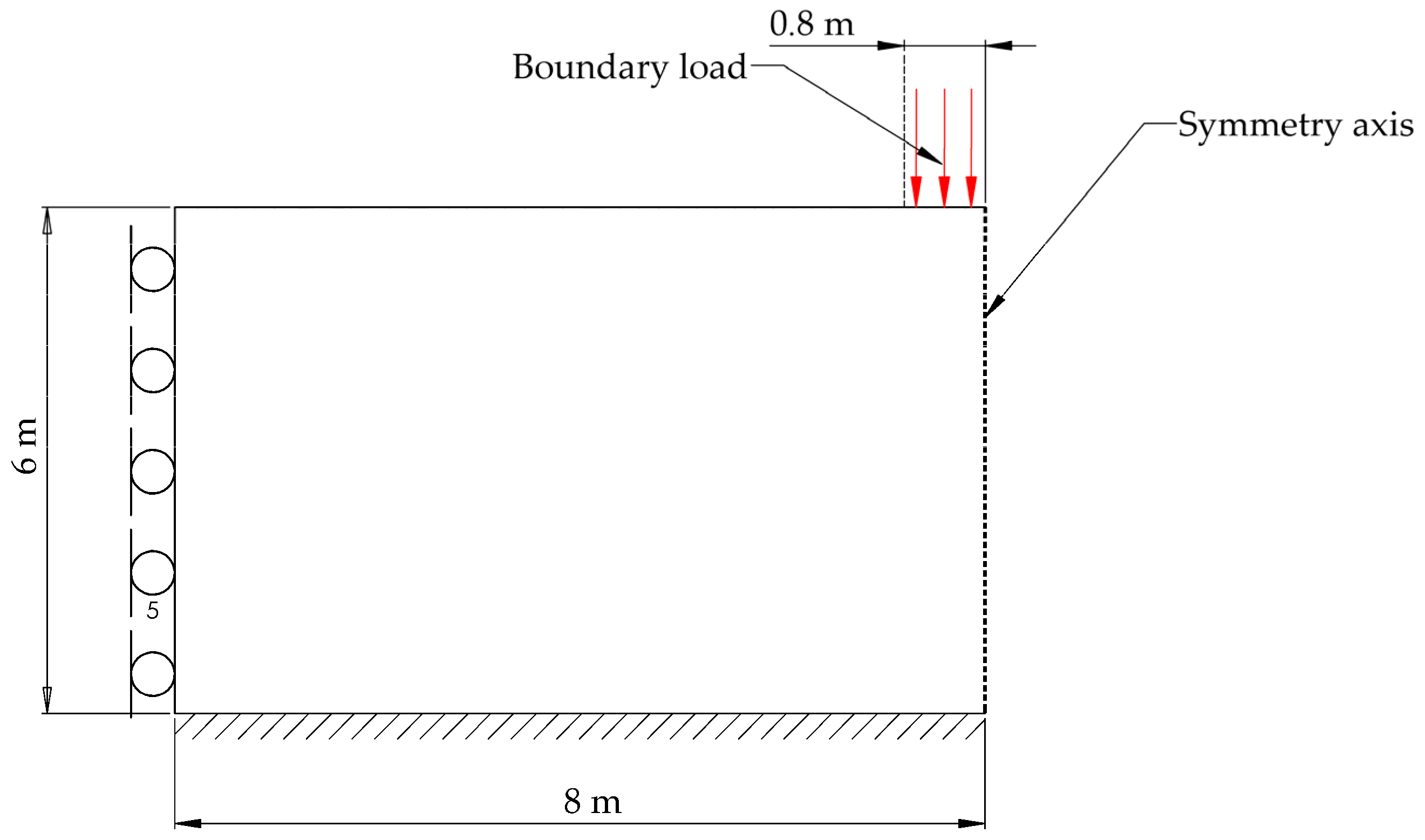 Figure 5. Dimensions, boundary conditions, and pressure load for the unsaturated soil model.
