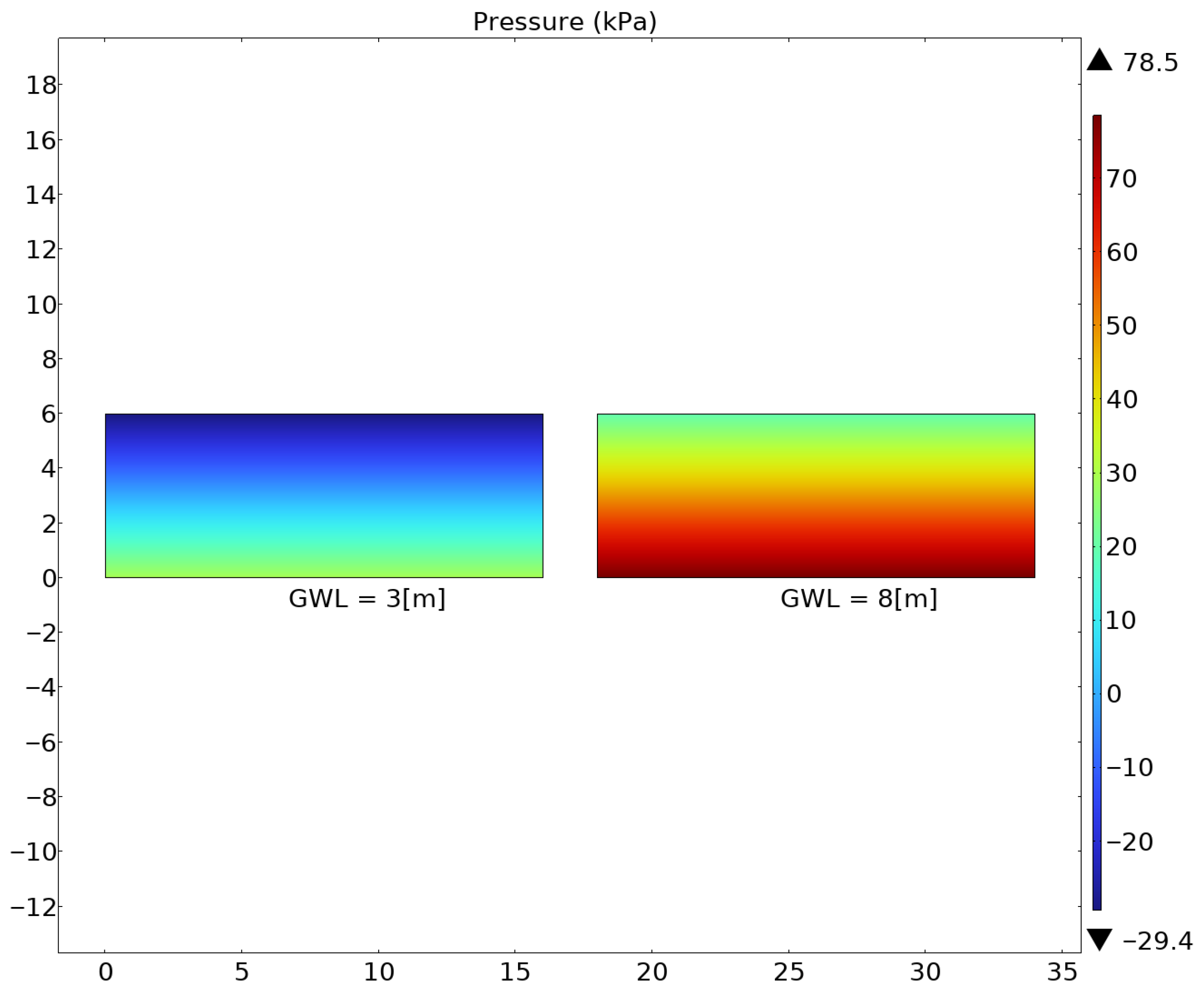 Figure 10. Pore pressure representation at different levels (3 and 8 m).