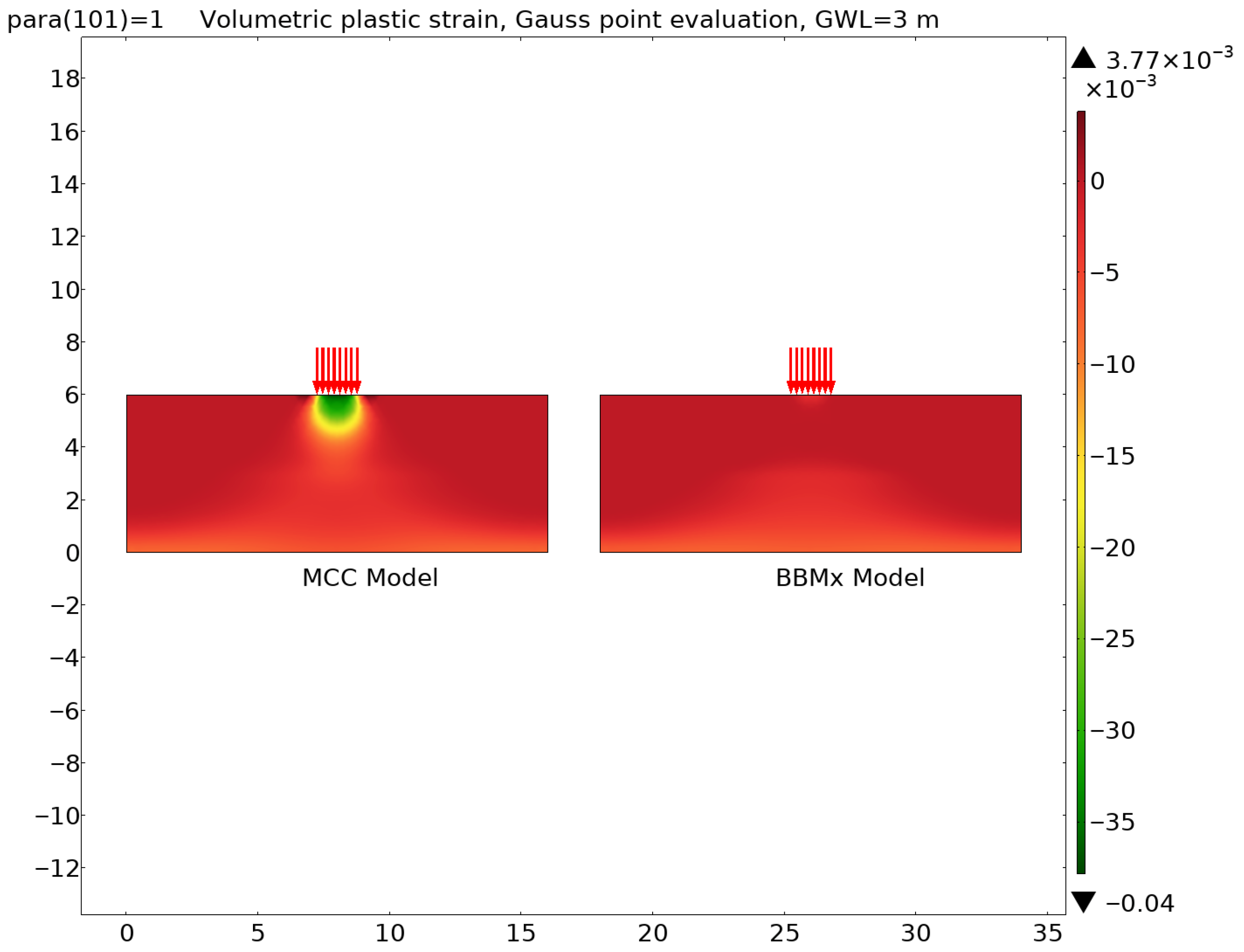 Figure 11. The Volumetric plastic strain for a ground water level of 3 m.