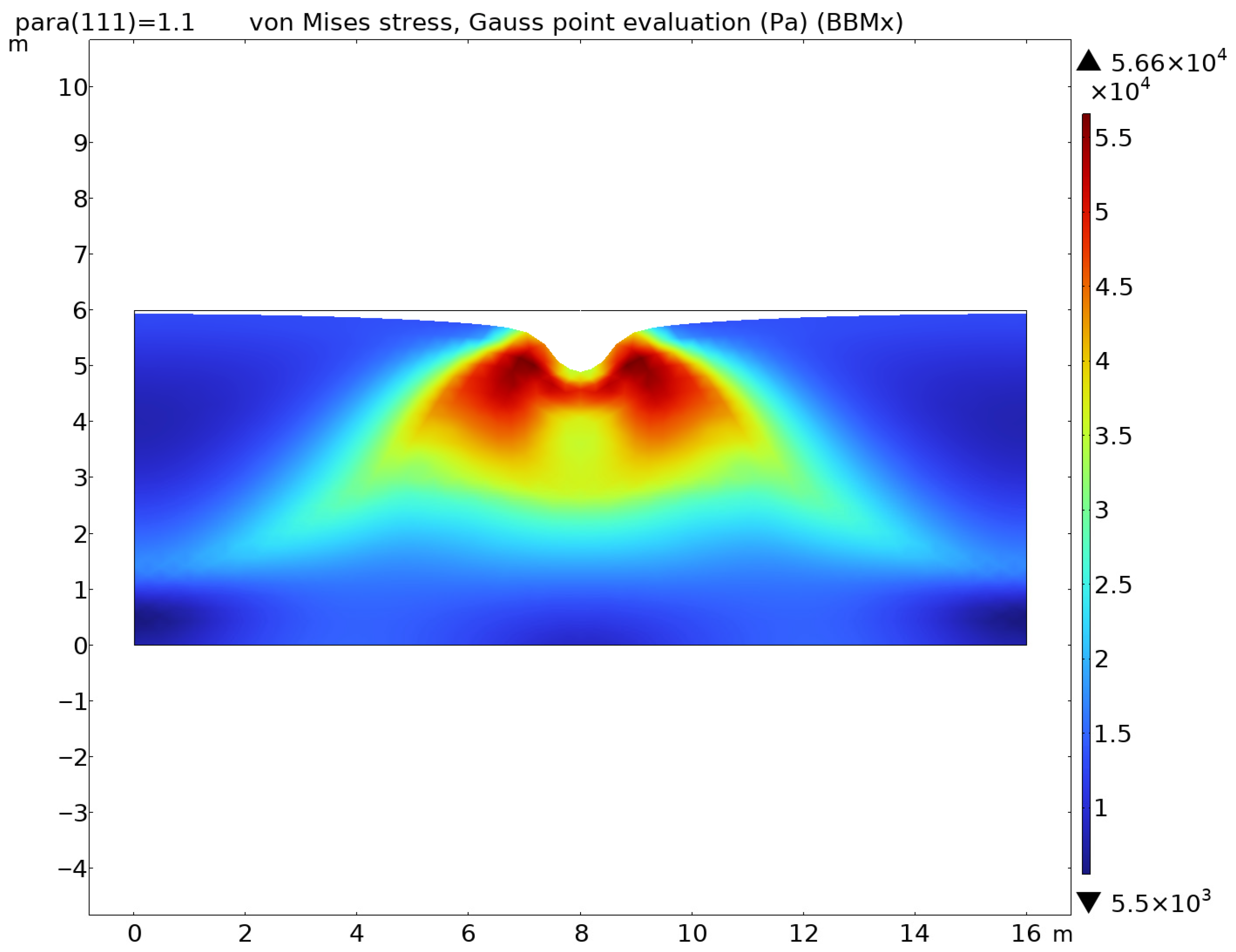 Figure 14. The von Mises stress distribution obtained using the BBX solver for saturated soil (ground water level of 8 m).