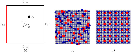 Top view of the investigated plate with an exemplary set of 36 (red) and 100 (blue) measurement points, based on Latin hypercube (b) and uniform (c) sampling, respectively. (a) Simulation setup, with force and boundary conditions [5]. (b) Latin hypercube sampling. (c) Uniform sampling.