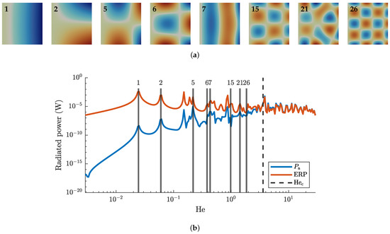 Solution of the benchmark problem. Indicated eigenmodes at 0.024, 0.06, 0.22, 0.38, 0.43, 0.98, 1.43, 1.85. The coincidence frequency for this setup is . (a) Real part of the mode shape for selected structural eigenmodes. (b) Radiated sound power based on BEM () and ERP.