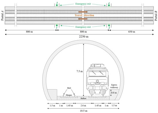 This study investigated the design of a single-tube double-track railway tunnel located in a mountainous area along an Italian high-speed/high-capacity rail line. It is 2250 m long, straight, and features a horseshoe-shaped cross-section with an area of 70 m2, a width of 10.5 m, and a height of 7.5 m (see Figure 1). The railway tunnel is characterized by an average upward longitudinal slope of 4.5‰ from Portal A to Portal B and is equipped with the minimum safety requirements established by European regulations [31]. It includes emergency exits every 800 m, for a total of two per side: the first pair (1 and 3) is located at 800 m and the second pair (2 and 4) at 1600 m from Portal A. The railway tunnel under consideration is subjected to natural ventilation only.