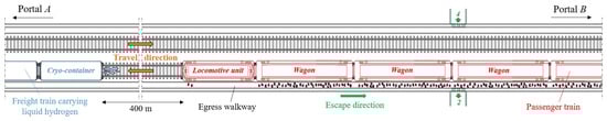 The operating model of the rail line along which the above-mentioned tunnel is located involves the simultaneous transit of both passenger and freight trains, including those carrying LH2.