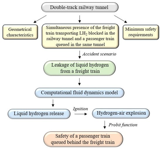 Nevertheless, a significant knowledge gap remains concerning the accidental release of LH2 from a freight train blocked inside a tunnel and its impact on the occupants of a passenger train queued on the same railway track. Given the lack of papers that have addressed the potential negative effects of LH2 release from a freight train on the safety of the occupants of a passenger train queued in the same tunnel tube, this research may contribute to increasing our knowledge by quantifying the corresponding risk level.