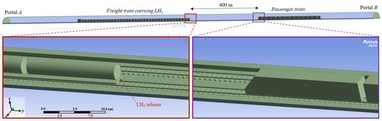The simulated accident scenario involves the LH2 release from the rear of the last cryo-container of the freight train, through a 50 mm diameter hole—typical value considered in quantitative risk assessments for accidental continuous release from tank containers [33,34]—located at approximately 1 m above the ballast surface (see Figure 2). The freight train is assumed to travel downhill towards Portal A, when it stops due to certain circumstances and starts to release LH2. This leakage is considered to occur at the midpoint of the tunnel length (1125 m from Portal A) as this location has been shown to maximize the size of the resulting flammable hydrogen cloud [35], which is expected to move towards Portal B due to the chimney effect induced by the longitudinal slope. Simultaneously, a passenger train is considered to enter the tunnel through Portal B using the same rail track, and to queue 400 m upstream of the LH2 leakage position, corresponding to the average length of a passenger train. The LH2 release is assumed to begin at time t = 0, when the passenger train stops.