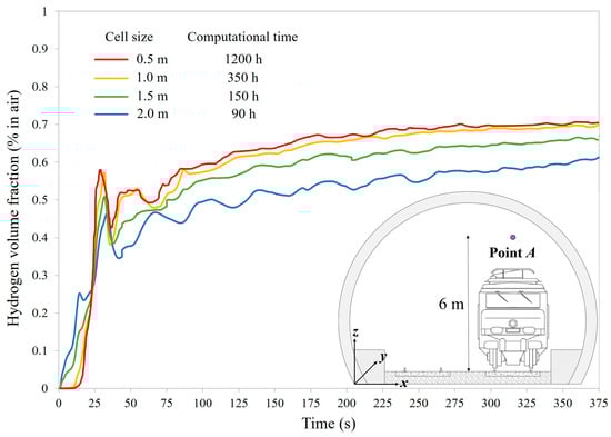 To accurately reproduce the LH2 release and evaporation process, the above-mentioned computational domain near the spill point was discretized using a very fine grid composed of tetrahedral cells with a side length of 0.025 m, corresponding to half the diameter of the LH2 leakage orifice [54]. Further away from the release site, a progressively coarser mesh resolution was adopted to contain the calculation time, with the maximum cell size determined through a grid sensitivity analysis. Figure 5 illustrates the time evolution of the hydrogen volume fraction at Point A, up to 375 s—the time when the entire LH2 content in the cryo-container was released—for tetrahedral cell dimensions of 0.5, 1, 1.5, and 2 m. Point A is located along the rail track axis used by the freight train carrying LH2 (x = 7.55 m), 10 m upstream of the spill site (y = 10 m), and at a height of 6 m above the ballast surface (z = 6.5 m).