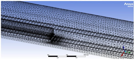 To simulate the explosion process, an additional mesh sensitivity analysis was conducted to determine the appropriate cell size that represented a suitable compromise between result accuracy and computational time. It was first necessary to define the tunnel region around the ignition point where the effects of the explosion are most pronounced, and within which the mesh would be progressively. It should be noted that the ignition site was considered near the release point—approximately 10 m upstream of the spill location (or 1135 m from Portal A)—where there is the most turbulence, and at a height that promotes hydrogen accumulation and potential ignition due to the electrical components (i.e., 6 m above the ballast surface) [28,62]. Once the ignition point and source—consisting of an electric spark of 0.1 J [63]—were defined, the criterion used to determine the domain region to be refined around the ignition site was based on the extent of the flammable hydrogen cloud at the moment of ignition. This is due to the presence of hydrogen in the mixture and the size of the cloud, which amplify the explosion’s intensity and, consequently, the propagation speed of the pressure waves [47]. In this respect, since current literature does not provide a specific reference for the exact time of ignition following a release, the most critical condition for the train passengers was considered. Within this framework, the ignition was assumed to occur 300 s after the accidental LH2 release, corresponding to the pre-movement time of the passengers.