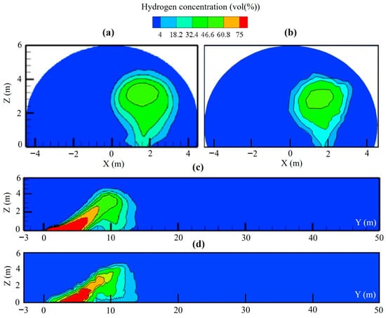 Comparison of the hydrogen concentration contours at: (a) y = 10 m cross-section obtained by Tang et al. [45]; (b) y = 10 m cross-section simulated by the develop model in our study; (c) x = 1.5 m cross-section obtained by Tang et al. [45]; (d) x = 1.5 m cross-section simulated by the develop model in our study.