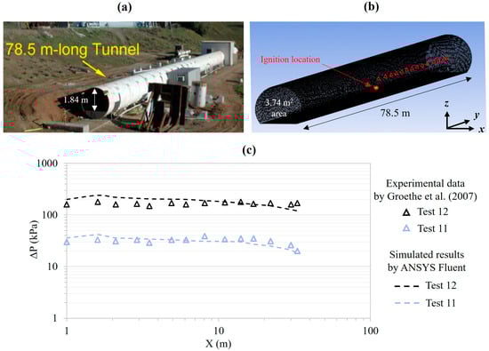 CFD code validation against a hydrogen–air explosion scenario: (a) tunnel facility of the experimental test by Groethe et al. [61]; (b) schematization of the tunnel in ANSYS Fluent; (c) comparison between the experimentally measured maximum overpressures and the simulated ones along the tunnel centerline downstream of the ignition source.