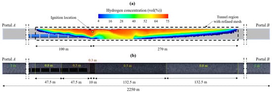 Based on the release simulations, after 300 s, the flammable hydrogen cloud extended for about 370 m, namely 100 and 270 m from the ignition point towards Portals A and B, respectively (Figure 9a). Therefore, the effects of the explosion are expected to be most marked along this 370 m-long tunnel portion, which was discretized using a progressively coarser mesh from the ignition site towards both tunnel portals (Figure 9b). Accordingly, the tunnel domain was subdivided into a total of 2,688,787 tetrahedral cells.