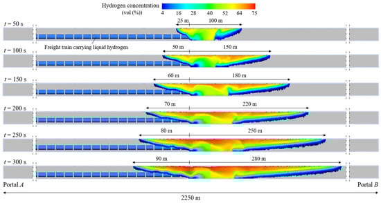 Figure 10 shows the spatial and temporal evolution of the flammable hydrogen cloud—with concentrations between 4% and 75% by volume in air—following the accidental LH2 release inside the investigated railway tunnel, up to the assumed ignition time (i.e., t = 300 s after the leakage). It can be observed that the highest concentrations are located beneath the tunnel lining due to the low density of hydrogen, which tends to rise once released. Furthermore, the propagation of the cloud is not symmetrical upstream and downstream of the leakage site due to the longitudinal slope, which generates a slight chimney effect towards Portal B. After 50, 100, 150, 200, 250, and 300 s since the release, the flammable hydrogen cloud reaches distances from the spill point of 100, 150, 180, 220, 250, and 280 m or 25, 50, 60, 70, 80, and 90 m towards Portal B or Portal A.