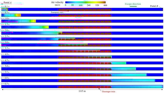 The ignition of the hydrogen cloud at stoichiometric concentration in air was assumed to occur 6 m above the ballast surface and 10 m from the rear of the cryo-container releasing LH2. Figure 11 illustrates the spatial and temporal evolution of the resulting pressure wave upstream of the ignition site, from t = 0.1 s to t = 6.5 s when the wave front reaches Portal B. Initially, a strong overpressure wave develops near the ignition point, as indicated by high airflow velocities (up to 400 m/s). Over time, the shock front propagates in the direction of the passenger train and Portal B, while the velocity field gradually decreases in intensity due to energy dissipation and wave expansion. The visualizations also indicate the interaction of the airflow with the stationary passenger train inside the tunnel, with the shock wave reaching: (i) the locomotive unit at the front of the train after 2 s from the moment of ignition; (ii) the emergency exit 2 approximately after 2.3 s; (iii) the rear of the passenger train after 4 s.