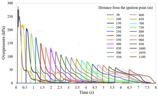 Figure 12, on the other hand, shows the overpressures over time resulting from the ignition of the H2-air mixture at various longitudinal positions at human breathing height (i.e., approximately 1.8 m above the egress walkway) along the tunnel region upstream of the freight train, starting from 50 m up to 1100 m from the ignition point. It can be observed that the shock wave propagates along the tunnel, reaching progressively greater distances as time advances. It is worth noting that the peak overpressure achieves: (i) approximately 137 kPa at the front of the passenger train—400 m from the release point, 2 s after ignition; (ii) about 84 kPa at the rear of the passenger train (i.e., around 750 m from the release point and at t = 4.2 s); (iii) about 55 kPa near Portal B—1110 m from the release point, approximately 6.5 s after ignition.