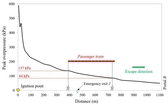 Figure 13 provides a clearer illustration of the peak overpressures upstream of the ignition point along the passenger evacuation route. Specifically, the overpressure reaches its maximum value of about 580 kPa at the ignition point and gradually decreases towards Portal B due to energy dissipation. Figure 13 also shows the position of the passenger train queued behind the freight train, along with the locations of: (i) the last user to evacuate—the passenger train operator positioned near the front of the train; (ii) the user located in the last wagon adjacent to the locomotive unit at the rear of the passenger train.