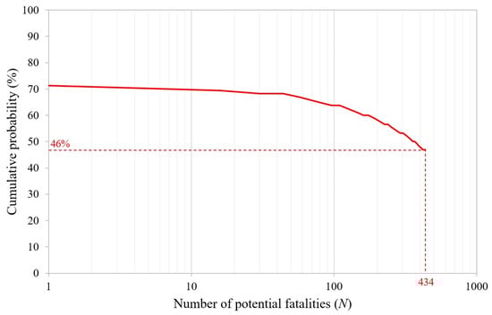 In this model, the damage level is represented by the peak overpressure experienced by an individual, which can cause a fatal pulmonary hemorrhage. According to this model, the two people near the front of the passenger train (i.e., the two train operators) have a 71% probability of death, whereas the cumulative probability of fatality for all the passengers (i.e., 434 occupants of the train) is 46%. Figure 14 illustrates the cumulative probability of experiencing N or more fatalities inside the investigated railway tunnel following the ignition of the hydrogen–air mixture.