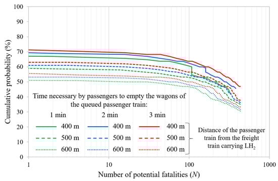 To assess the impact of passenger pre-movement time and/or the distance between the freight and passenger trains, the study was extended in two directions. First, two shorter times for the occupants to leave the wagons of the queued passenger train were considered—1 and 2 min instead of the previously assumed 3 min. These were added to the 2 min detection time, resulting in total pre-movement times of 3 and 4 min, compared to the 5 min assumed in the baseline scenario. Such a reduction could be achieved, for example, through an onboard alarm system that promptly alerts the passengers to evacuate as soon as the train stops behind the freight train releasing LH2. Second, two increased safety distances between the freight and passenger trains were also analyzed—500 and 600 m, compared to the original 400 m. Figure 15 shows that the probability of having a given number of potential fatalities N reduces by decreasing the tpre and/or increasing the safety distance between the two trains. For instance, when the distance between the two trains is 400 m, the probability of having 100 potential fatalities decreases from about 65% to 60% as tpre is reduced from 5 min to 3 min. Similarly, assuming a pre-movement time of 5 min, the probability of having the same number of potential fatalities decreases from approximately 65% to 50% when the distance between the two trains increases from 400 m to 600 m. However, it should be emphasized that a railway traffic management model aimed at ensuring a higher level of user safety should prevent the simultaneous presence of freight and passenger trains within the same tunnel tube. For instance, freight trains could be scheduled to transit only at night, when the number of passenger trains traveling is reduced.