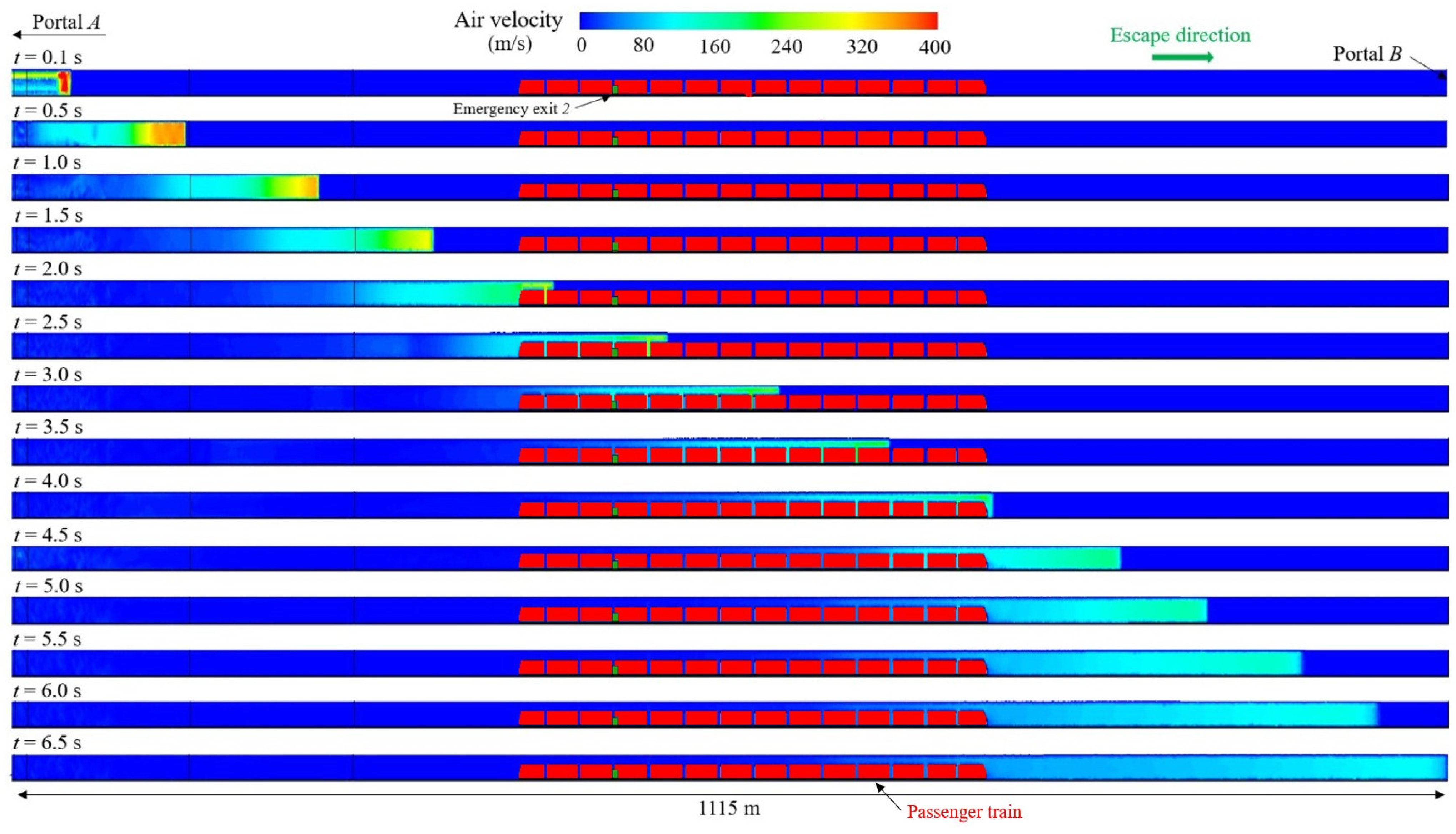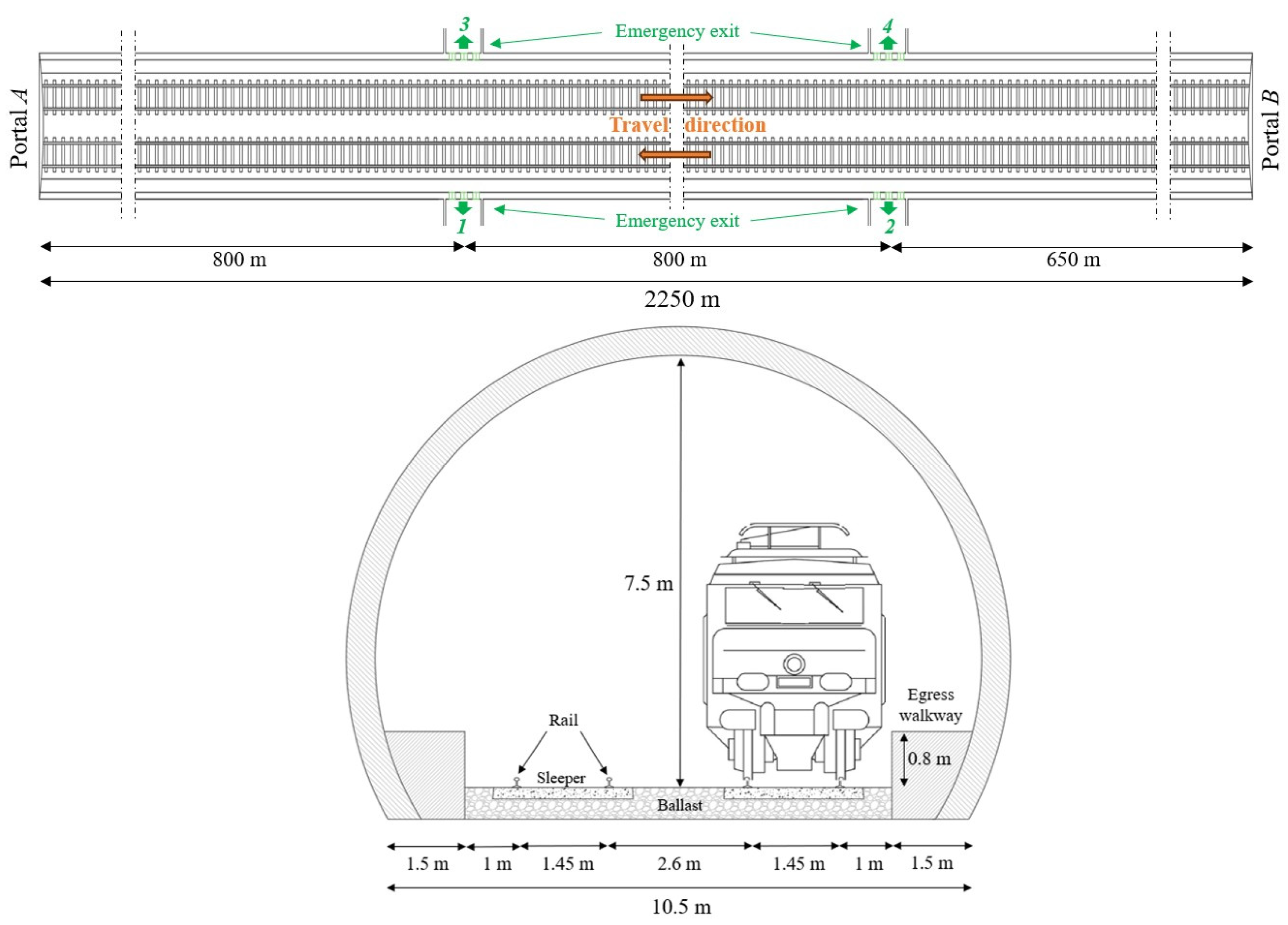 Martini et al. [23] | CFD simulations of a 10 MW fire originating from a passenger carriage and a 250 MW fire involving a freight wagon in a 2 km long railway tunnel | The minimum airflow required to keep the exits safe was determined based on several factors, such as fire location, wind conditions, and whether it is a single or twin railway tunnel |