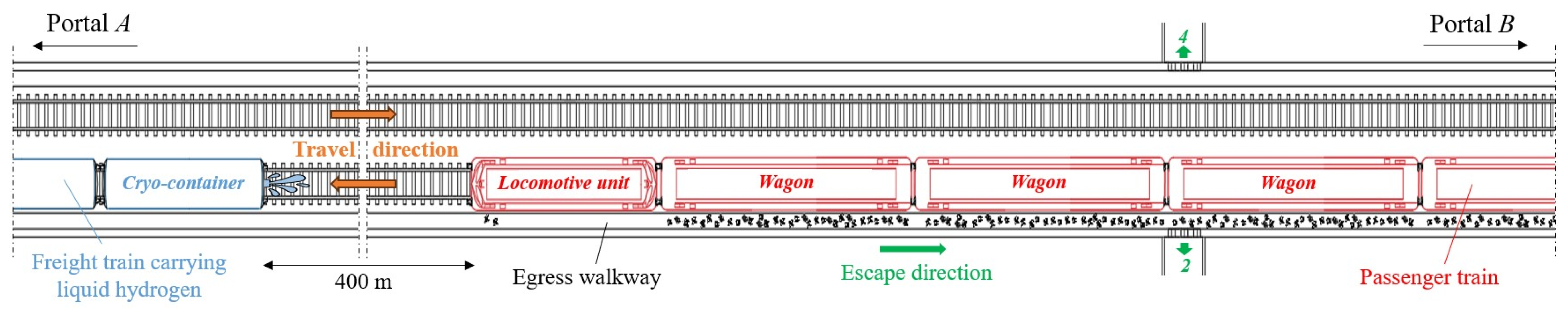 - Hakimzadeh, B.; Talaee, M.R. Analysis of a new strategy for emergency ventilation and escape scenario in long railway tunnels in the fire mode. Proc. Inst. Mech. Eng. Pt. F J. Rail Rapid Transit 2018, 233, 239–250. [Google Scholar] [CrossRef]