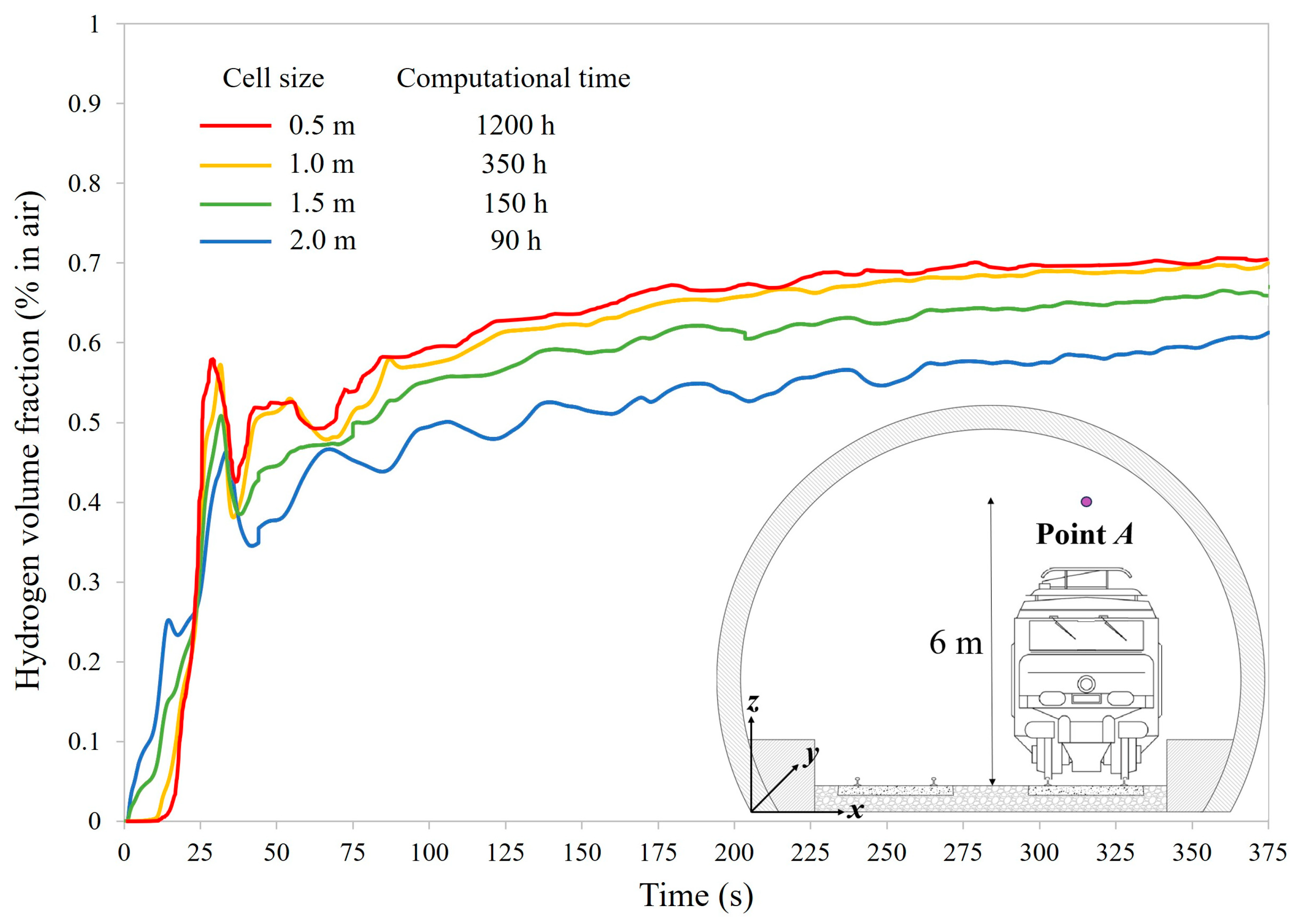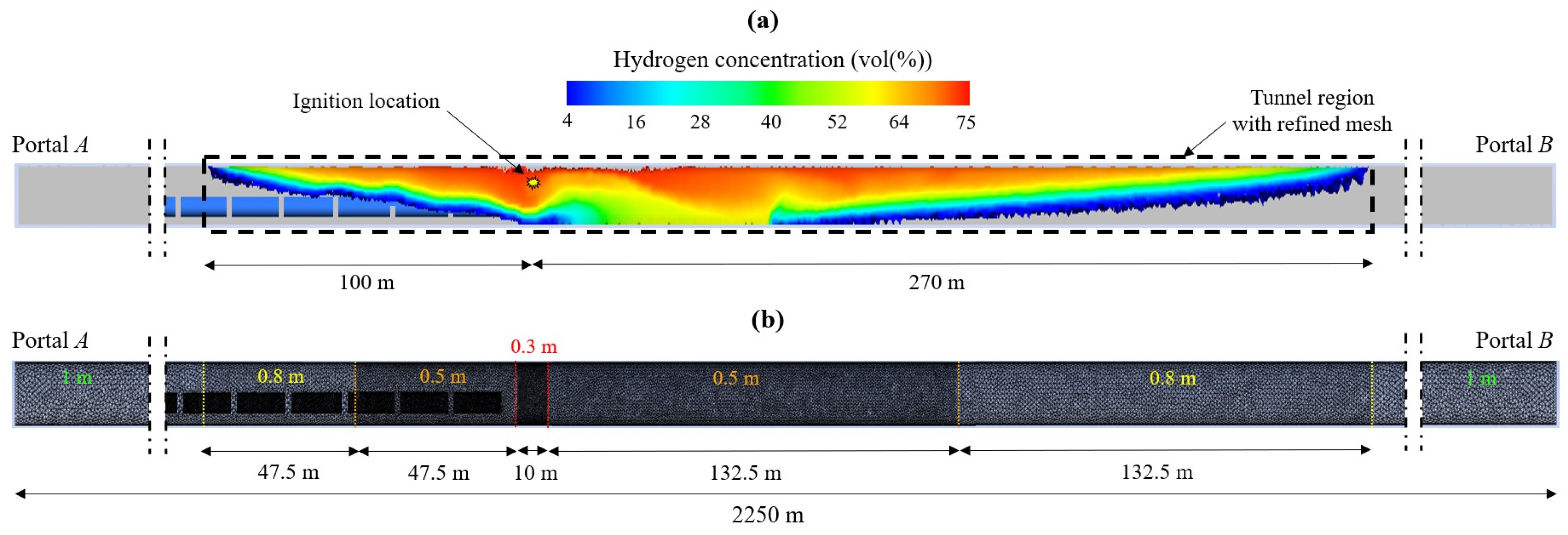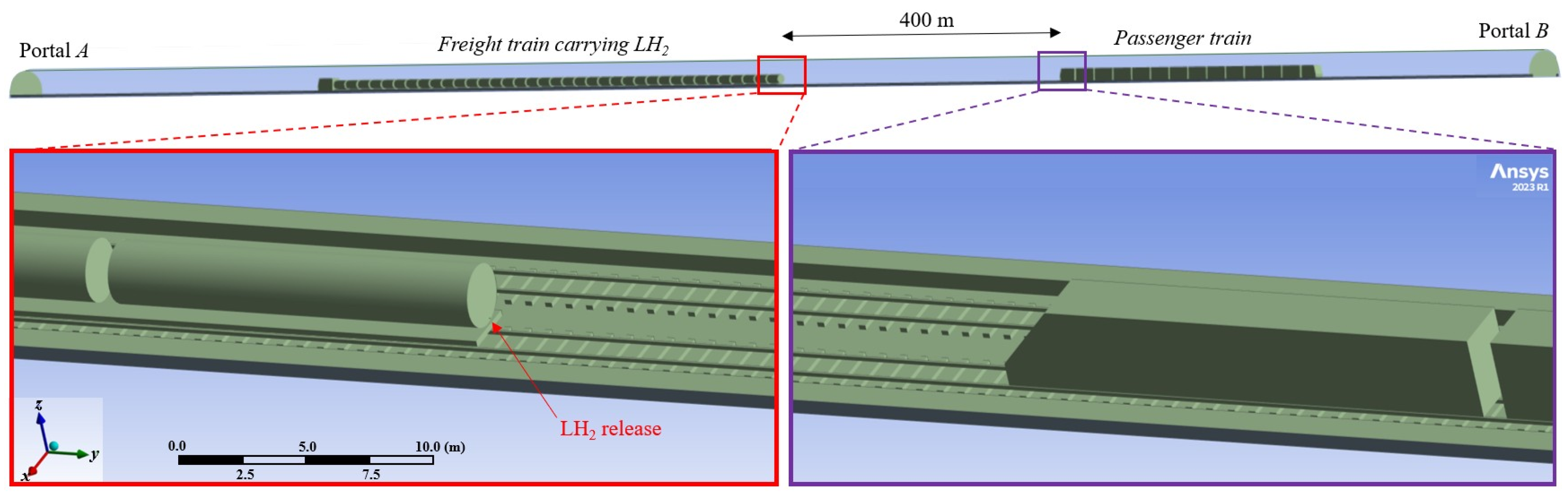 Gong et al. [28] | Numerical assessment of the influence of ignition time and mass flow rate on hydrogen distribution, overpressure, and propagation of the pressure wave after a spill from a hydrogen-powered train in a tunnel | Unlike road tunnels, the authors emphasize how trains occupy a large portion of the tunnel cross-section, reducing the free space where overpressures can dissipate and increasing reflection phenomena |