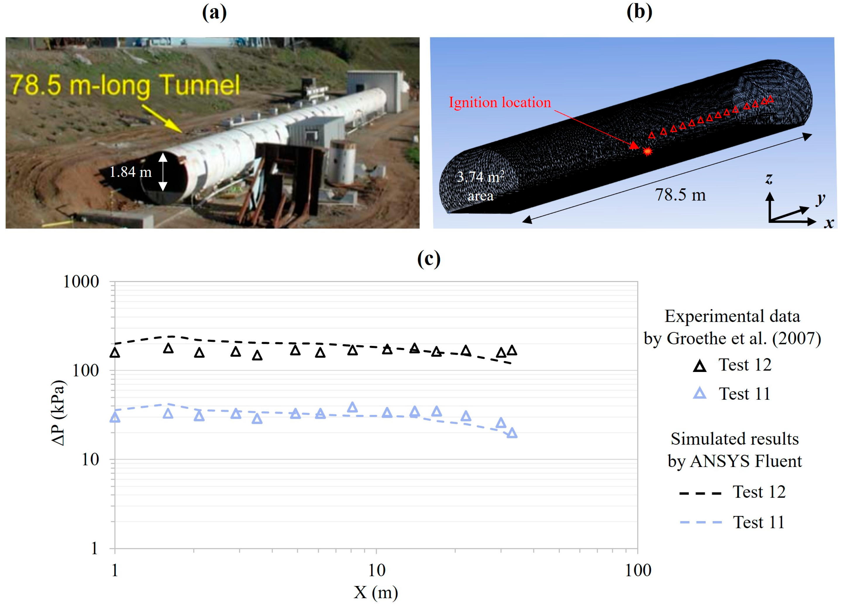 Amouzandeh et al. [17] | CFD analyses of a 28 MW fire due to methane release by a freight train in a tunnel, assuming different tunnel cross-sections and longitudinal ventilation conditions | Temperatures and airflow velocity were found to increase as the tunnel cross-section area decreased, and an airflow velocity of 3 m/s was found to prevent the back-layering phenomenon |