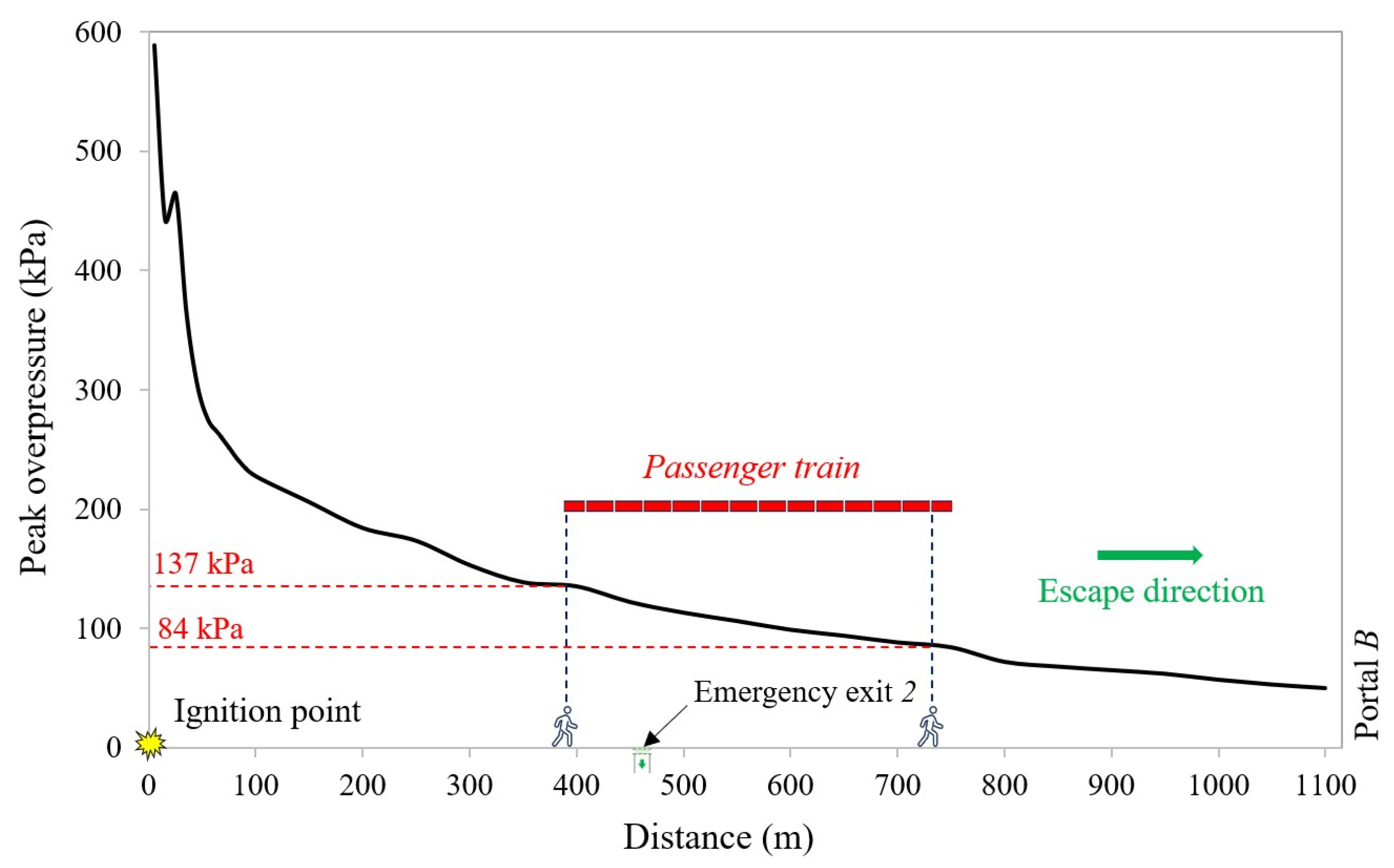 Cábová et al. [19] | CFD analysis of a 20 MW fire originating from a passenger train wagon in a 1.7 km long naturally ventilated tunnel | The fire-induced threats remained localized within 350 m around the burning source after 5 min from its ignition, potentially compromising user evacuation |