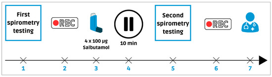Sequence of digital lung auscultation and spirometry recordings. Legend: (1) First spirometry test. (2) First digital lung sounds recording. (3) Bronchodilator administration. (4) 10 min break. (5) Second spirometry test. (6) Second recording. (7) Follow-up consultation with a pulmonologist.