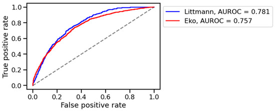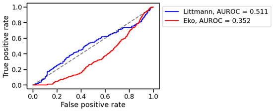 The algorithm distinguished healthy from pathological digital lung auscultation patterns validated by spirometric difference values in the training set, achieving an AUROC of 0.763. Performance in the training set was similar across devices, with AUROC values for the training set of 0.781 for the 3M™ Littmann® CORE digital stethoscope and 0.757 for the 3M™ Eko® CORE digital stethoscope (Figure 2). However, the model’s performance declined in the validation set, with AUROC values of 0.511 for the Littmann® and 0.352 for the Eko® stethoscope (Figure 3). Bootstrapped comparisons confirmed a statistically significant difference (p < 0.001) between the training and validation performances for both stethoscopes.
