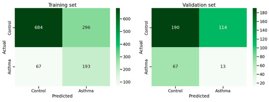 The confusion matrices for the training and validation sets are shown in Figure 4 and the precision, sensitivity, and recall are shown in Supplementary Table S2. We observe a significant drop in precision and sensitivity on the validation set, indicating that asthma cases unseen during training are difficult to detect.