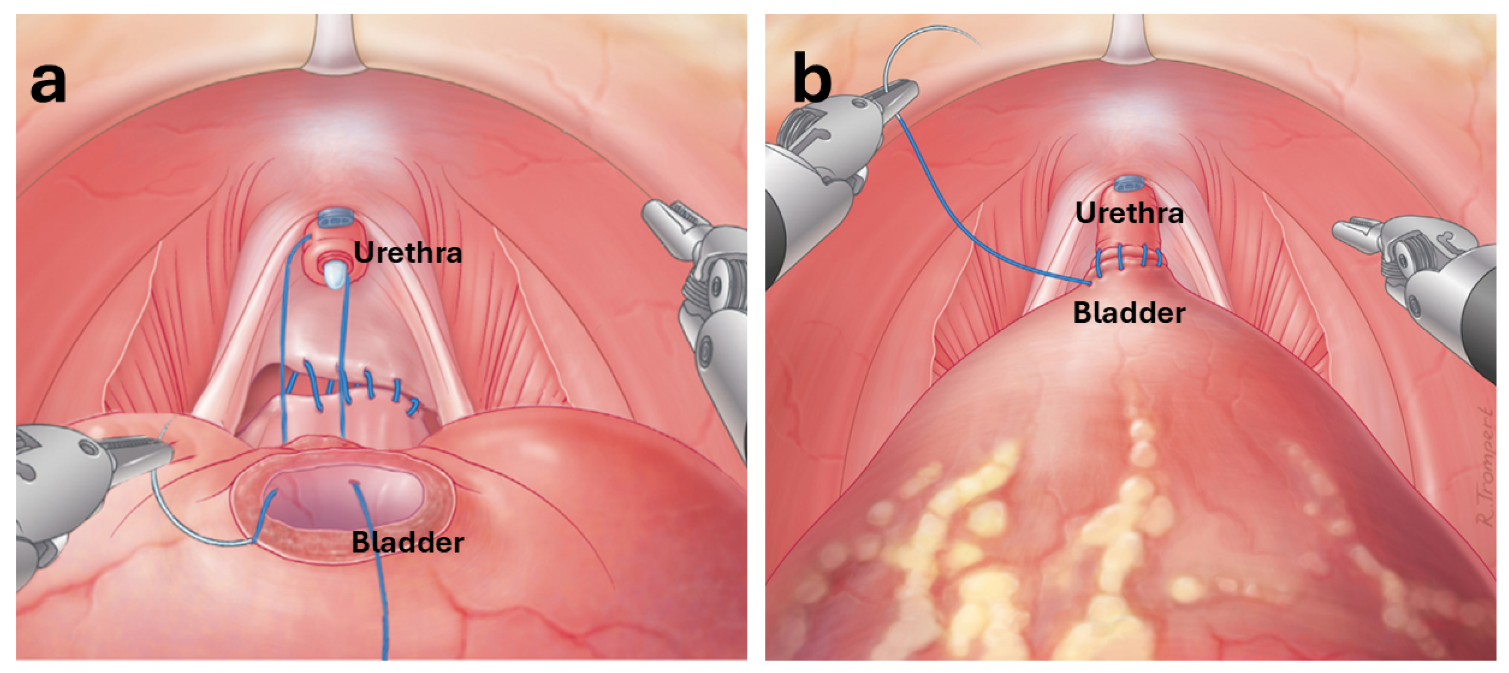 - Vis, A.N.; van der Poel, H.G.; Ruiter, A.E.; Hu, J.C.; Tewari, A.K.; Rocco, B.; Patel, V.R.; Razdan, S.; Nieuwenhuijzen, J.A. Posterior, anterior, and periurethral surgical reconstruction of urinary continence mechanisms in robot-assisted radical prostatectomy: A description and video compilation of commonly performed surgical techniques. Eur. Urol. 2019, 76, 814–822. [Google Scholar] [CrossRef]