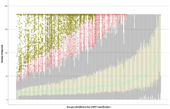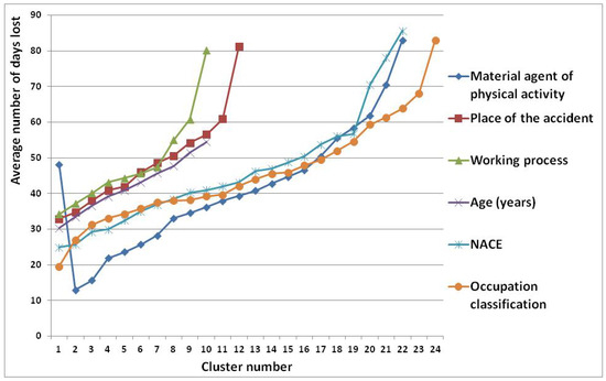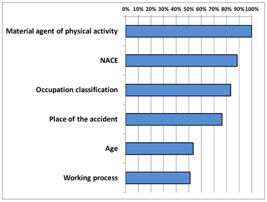 - The highest accident-related absence (mining): The highest absence (over 75 days) was primarily identified in professions and economic activities (NACE) related to various types of mining—both underground and open pit—especially hard coal, but also, less frequently, metal ore mining and, slightly more often, oil and natural gas extraction. Moreover, this group also includes some economic activities, with a little shorter absence duration, related to the construction of specific civil engineering structures, service supporting land transportation, the distribution of electricity, the production and supply of hot water, and very few forestry-related services. Occupation: The professions performed in this group were clearly related to economic activities, and therefore included all types of mine workers (unskilled and skilled, supervisors, engineers, mechanics and operators of mining, drilling and loading equipment and machines), as well as professions used in mining, such as ironworkers (metalworkers), various steel and railway structure assemblers, and construction workers like bricklayers, assistants, and painters. This group also included, but less frequently and with shorter absences, lumberjacks/tree fellers and carpenters. Place of accident: As expected, places of accidents were mainly underground mines and quarries, open-pit mines, public transport areas, places of production, factories, workshops, and construction sites. Process: The most common working process in this group, by far, was mining and earthworks. Next in order was the factor that occurred in every group—movement, including means of transport. The third encompassed all manual works like setting up, installing, mounting, dismantling, taking apart, etc. Lastly, production and processing accounted for the remaining portion, bringing the total to over 80% of the working processes overall. Material agent: The most common material agents of physical activity were underground facilities, tunnels, walkways, movable structures, and surfaces above ground level. What makes this group particularly unique is the significantly lower frequency of the most common material agent—“Floors and other fixed horizontal surfaces at ground level”—which appears very often in every other group. In contrast, various objects commonly used in mining, such as manually transported or moved loads, portable or mobile machines for extracting materials or earthworks, constructions materials, debris and other fragmented materials, rail vehicles, stationary machines for extracting materials or earthworks, mechanized hand tools for drilling, screwing, bolting, and stationary conveyors, continuous motion transport devices and systems and their equipment, were much more common. Age: This group also included older workers, as the mean age was 49 years old (almost 8 years more than other groups) with a standard deviation 8.6. It is worth noting that when the accident was in any way related to mining, it led to a significantly longer absence.