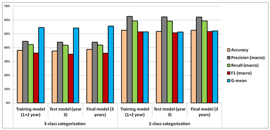 - Categorical predictions: In addition, the numeric range of the target variable was discretized into three and two categories, and in these scenarios, performance was measured using accuracy, precision, recall, F1-score, and G-mean [4,46,47,48]. Precision, recall, and F1-score were computed per class and then macro-averaged to ensure equal treatment of all classes. G-mean was calculated as the geometric mean of class-wise recalls.