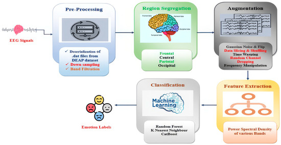 Emotion plays a vital role in human life and their experiences, directly influencing how individuals perceive and interrelate with the world around them. Though it is considered to be one of the complicated processes, its evolving nature enables it to comprehend both psychological and physiological reactions to various experiences [1]. Psychologically, emotions are classified through subjective feelings such as happiness, sadness, anger, or fear, which occur as a result of one’s mental valuation of a given situation. Emotions further affect thinking, decisions, and behaviors and tend to induce actions in correspondence with the emotional state. Behaviorally, emotions are articulated through facial appearance, posture, and even behavior, which gives important cues during social interaction. Physiologically, emotions produce non-psychological reactions like changes in heart rate, blood pressure, skin conductance, and brain activity. These body reactions help prepare us to respond to emotions, for example: preparing to fight or run away when we feel fear or stress. Emotion recognition [2], an emotional state identification process, is crucial for enhancing HCI, mental health treatment, and user experience. Emotions, the very essence of human cognition, can be identified through non-physiological signals, such as facial expressions and speech, and electrocardiography (ECG). Out of the many options, EEG signals [3] are the most popular choice for emotion recognition because they are fast, non-invasive, and inexpensive. EEG, with good temporal resolution, records neural activity directly, which is real-time, objective, and difficult to fake. These signals, which are produced in the process of experiencing emotions, provide useful information about brain activity and cognitive state and are, therefore, excellent for emotion recognition. Over the last decade, emotion recognition employing EEG signals has emerged as a key area of research, making effective use of machine learning (ML) and deep learning (DL). Though a significant amount of work has been carried out in this regard, building ML [4] or DL models [5,6] for EEG-based emotion recognition is challenging due to limited and imbalanced datasets, high inter-subject variability, and the high-dimensional nature of EEG signals. Deep learning models, though quite powerful, often need considerable computational resources and suffer from a lack of interpretability, making them less suitable for real-time or sensitive applications. Additionally, the dependence on multiple EEG channels adds complexity to the input data, posing a unique challenge for emotion recognition. Recent years have witnessed the emergence of numerous DL models; one such model is the generative adversarial network (GAN) [7,8], which intends to enhance datasets artificially for EEG classification tasks. Though these approaches are influential, they may not be quite suitable for all EEG-based applications due to the requirement of substantial computational resources. Furthermore, the complex architecture of GANs and other DL models raises concerns about interpretability, as they function as “black boxes,” making it quite challenging to understand as well as interpret how specific features contribute to emotion recognition. To address these challenges, we introduce FREQ-EER: a novel frequency-driven ensemble framework for emotion recognition and classification of EEG signals. The major contribution of the paper is as follows: