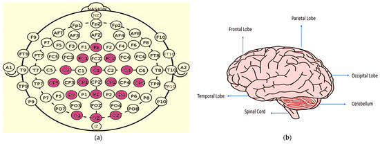 EEG signals are obtained by the placement of electrodes on human scalp, capturing the brain’s electrical activity. The accuracy and reliability of the emotion classification system is largely dependent upon the placement of electrodes and the signal capture hardware utilized. A number of different methods have been developed for electrode placement towards signal acquisition; among them the International 10–20 system is the most widely used and accepted framework for clinical purpose and research work. The system, represented in Figure 3a, sets out specific electrode placements in the scalp ensuring consistent interelectrode spacing and labeling based on scalp positions. The different labels established are frontal (F), central (C), parietal (P), occipital (O), and temporal (T), with intermediate positions (e.g., FC (Frontal Central), CP (Central Parietal), PO (Parietal Occipital)) and midline points (e.g., Fz, Cz, Pz). Left-side electrodes have odd numbers, while right-side electrodes have even numbers. The second visual reference, Figure 3b, illustrates the segregation of the human brain based on various lobes, with each lobe corresponding to specific cognitive and emotional functions. This mapping from the electrode placement to brain lobe helps researchers form a strategic selection of electrodes based on the emotional relevance of brain regions, which in turn helps reduce the number of electrodes. This knowledge helped us select specific electrodes such as the frontal lobe for emotional regulation (F3, F4, F7, F8), the temporal lobe for emotional memory (T3, T4, T5, T6), and the occipital lobe for visual emotion processing (O1, O2), instead of using all 32 channels of the DEAP dataset. Furthermore, a detailed analysis of brain–band emotion relationships was carried out where different frequency bands correlated with specific brain lobes or specific sets of emotions were investigated.