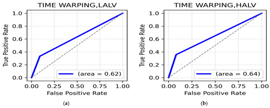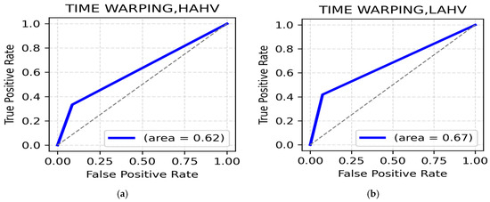 Relative to other techniques, time warping delivered moderate classification performance on GAMEEMO wherein the accuracies reported were 89% for boring, 92% for calm, 94% for horror, and 92% for funny, leading to an overall accuracy of 91.2% (Table 18). ROC curves (Figure 17c) with AUC values ranging between 0.98 and 0.99 across the four classes demonstrate strong separability of the model.