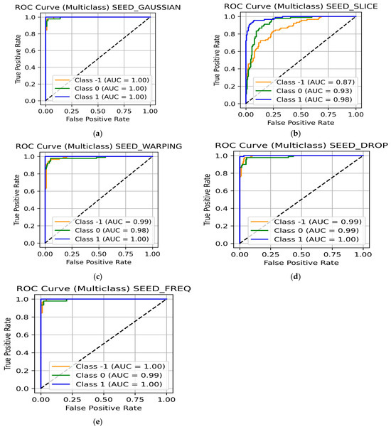 ROC curve for the SEED using (a) Gaussian noise addition and flip; (b) data slicing and shuffling; (c) time warping; (d) random channel dropping; and (e) frequency manipulation.