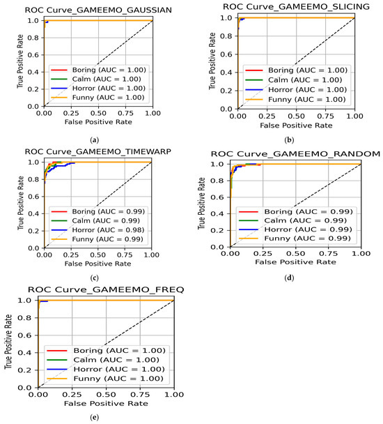 ROC curve for GAMEEMO dataset using (a) Gaussian noise addition and flip; (b) data slicing and shuffling; (c) time warping; (d) random channel dropping; and (e) frequency manipulation.