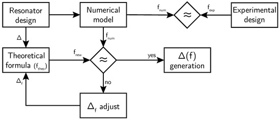 Thus, for a single value of , two resonance frequency values are obtained: on the one hand, the numerical result of the resonance frequency , and on the other hand, the theoretical frequency is calculated using Equation (1) (see Figure 4).