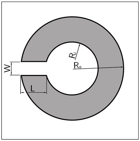 Geometry of the SC-embedded Helmholtz resonator considered in this study. The main dimensions are indicated: (internal radius of the cavity), (external radius of the scatterer), W (width of the neck) and L (length of the neck).