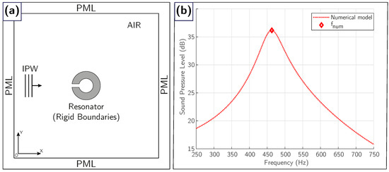 Figure 3a shows the basic geometry of the numerical model and boundary conditions, and Figure 3b shows an example of the frequency-dependent sound pressure level in dB inside a certain SC-embedded resonator, obtained via FEM simulation.