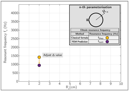 Figure 4 shows a simplified comparison between two resonant frequencies obtained for the same resonator; the theoretical value (), represented by an orange dot, is compared against the numerical value ().