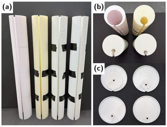 Figure 5 depicts different views of the 3D-printed SC-embedded resonators that have been used for validation. Figure 5a shows the front view of the four resonators; in Figure 5b they are shown from the top. Figure 5c presents the 3D-printed lids designed to close the resonator and insert the measuring microphone.