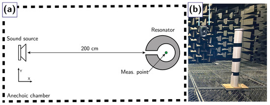 (a) Diagram of the experimental setup showing the position of the resonator relative to the sound source. (b) Photograph of the resonator placed in the anechoic chamber in front of the sound source.