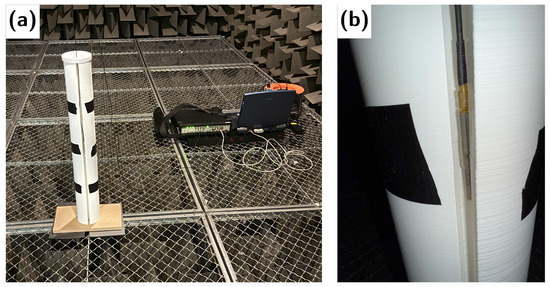In Figure 7a, the resonator and the measuring equipment can be observed in their respective positions in the anechoic chamber. Figure 7b shows the microphone inserted inside the resonator in a measurement position.