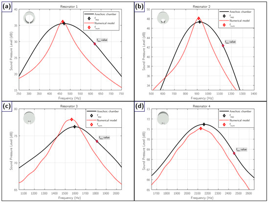 Figure 8 presents the results for all four resonators. The experimental measurements obtained in the anechoic chamber are shown as solid black curves (), while the numerical model predictions are represented in red with dashed lines (). Each subfigure also includes a marker indicating the theoretical resonance frequency derived from Helmholtz’s formula (). Subfigures (a) through (d) correspond to resonators No. 1 to No. 4, respectively. Overall, there is a strong agreement between the experimental data and the numerical predictions, whereas the theoretical estimates show notable deviations. Table 4 summarizes the percentage deviations between each approximation and the experimentally measured values.
