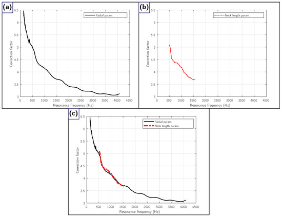 Figure 9 shows the evolution of the correction factor as a function of resonance frequency, obtained from two parametric studies on the geometry of the SC-embedded resonator. Figure 9a shows the curve corresponding to the variation in the internal radius of the cavity, keeping the dimensions of the neck constant. This configuration allows a wide range of resonance frequencies to be explored, from approximately 100 to 4000 Hz. Figure 9b analyses the influence of neck length L, keeping the volume of the cavity constant. In this case, the frequency range is more limited, between 500 and 1500 Hz, due to the geometric restrictions imposed by the volume and size of the scatterer. Figure 9c shows a significant coincidence between both parameterisations in the shared frequency range, which lends solidity and coherence to the proposed methodology.