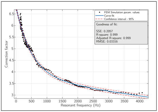 Based on the data obtained through numerical simulation, a chart was generated (see Figure 10) that allows the correction factor value to be determined based on the resonance frequency. The curve fit obtained exhibits an exceptionally high degree of correlation (R2 = 0.999), ensuring outstanding accuracy in its application. As evidenced in the analysis performed, applying the value derived from the abacus yields a match with the numerical prediction with a margin of error of less than 5%.