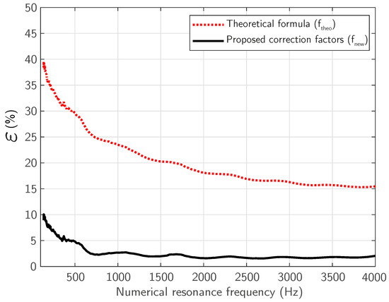 The use of the proposed correction factor substantially minimises the prediction error of the resonance frequency. In the most unfavourable scenario, corresponding to high frequency, the percentage discrepancy is reduced nearly by half. At low and medium frequencies, this improvement is even more significant, with reductions reaching up to an order of magnitude compared to the use of a constant factor.